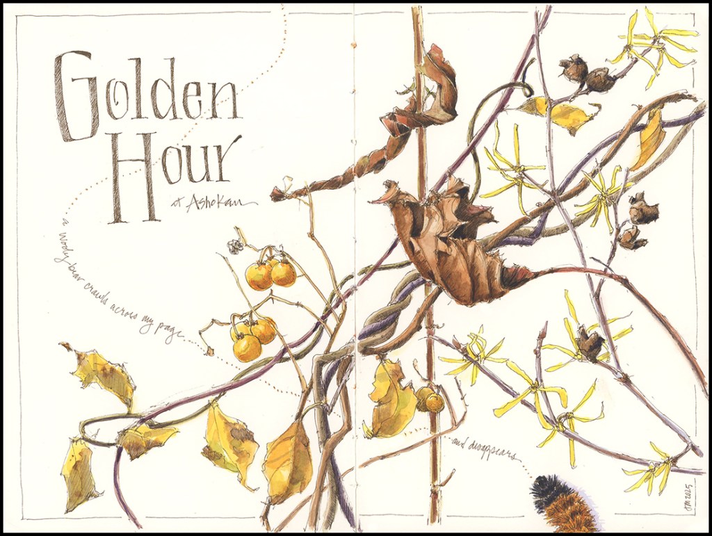 Last weekend I had the pleasure of teaching a four-day botanical and nature sketching retreat at The Ashokan Center in the Catskill Mountains. Hosted by Draw Botanical, it was a joy to work alongside the amazingly accomplished Wendy Hollender, Lara Call Gastinger, Giacomina Ferrillo, Vern Fannin, and nearly 70 participants. I started this page during a session I led on “Sketching on the Go.” It was late afternoon and the setting sun’s still warm light cast its last glow over fields and woods. But really, anytime I get an hour to sketch outside in the company of other artists is golden.