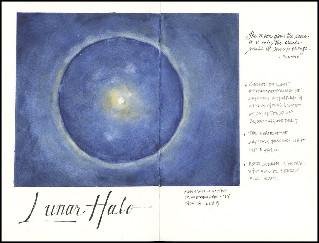 For those who prefer science to poetry, a bright halo around the moon is caused by light refracted through ice crystals suspended in cirrus clouds located at altitudes of 20,000 to 40,000 feet. Seeing one is more common in winter when the moon is full or nearly so. But no matter how you approach it, it’s an inspiring sight.