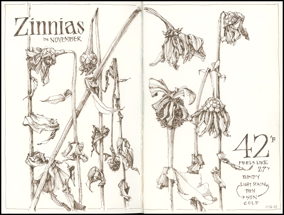 The leaves are mostly fallen, and November has turned cold. Still, I haven’t found time to fully put the garden to bed. I’ve left some coneflowers for the birds to pick over and the zinnias are mostly standing upright and brown. I love their curling leaves and stray petals, now dried and drooping or sticking out every which way. They gave me one last chance for a sketch before meeting the compost pile. Cold as it was, it was good to be outside, remembering summer, and savoring this last moment in the garden.