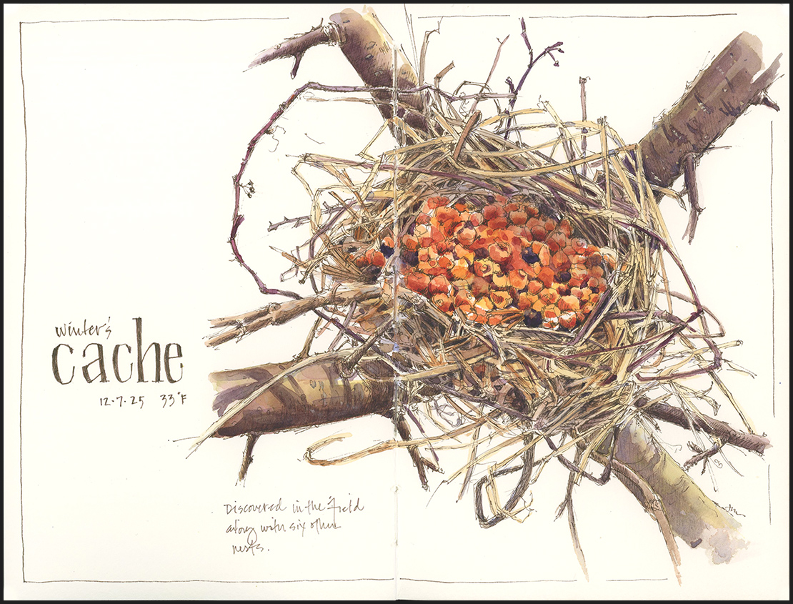 Last week’s snowfall coated nearby fields and hedgerows and, lucky for me, left little clumps of snow atop of bird nests that were formerly hidden. I waded into the shrubby field adjacent to our house to have a look around. It didn’t take long before I found several nests amidst the waist-high goldenrod, thorny vines, shrubs, and pioneer white pines. This one had been repurposed by mice as a larder of bittersweet and rose hips. Though not an unusual practice, it was a rather colorful surprise and quite worth the cold feet and hands.