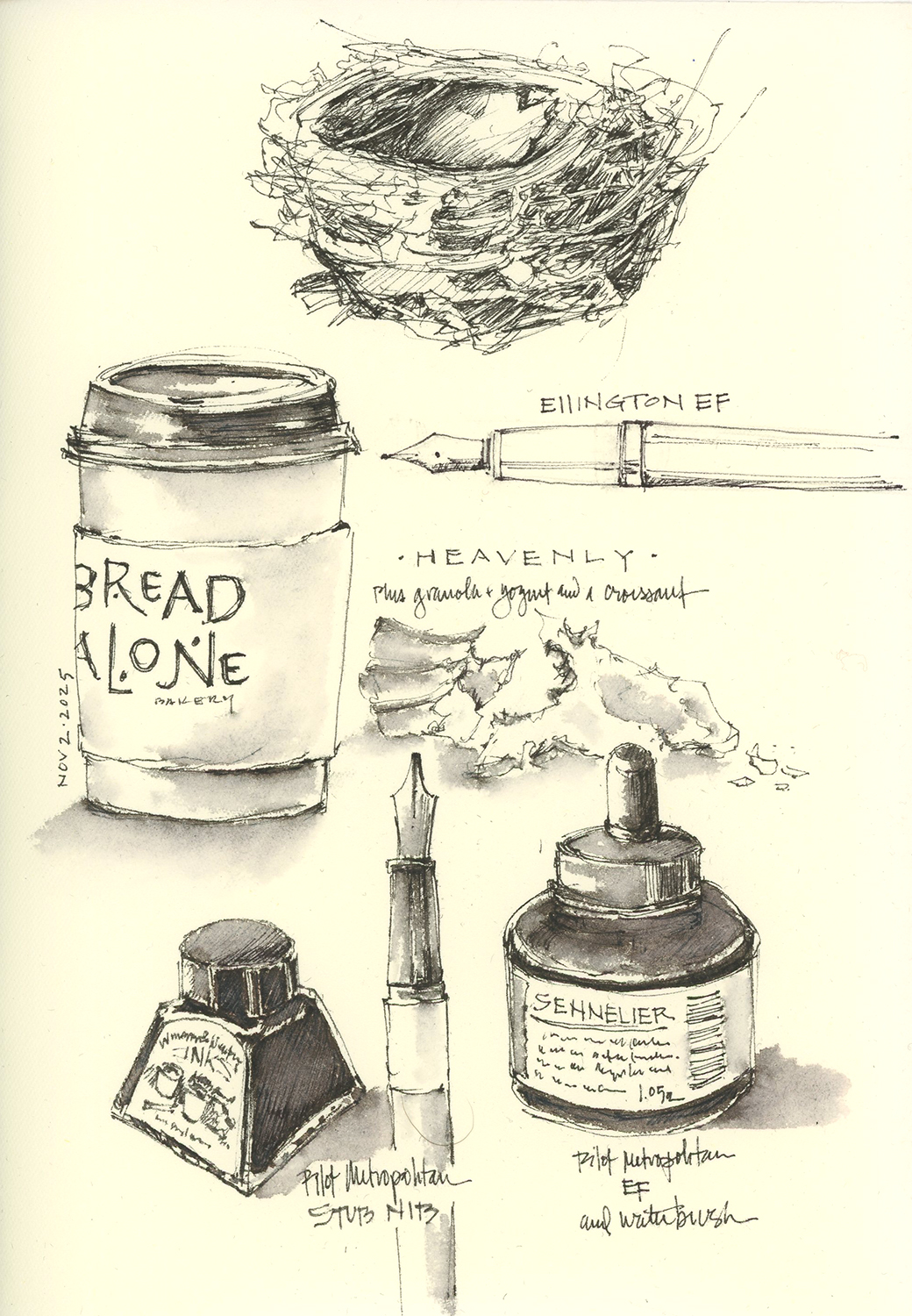 Tips and Techniques– Drawn with Ellington Pen’s Alpine Rose EF fountain pen with Jacque Herbin writing ink in an Italian-made journal with cream, laid paper. I find that the texture of this paper slows the drawing process, as the fountain pen doesn’t glide across the paper the way it would on smooth paper. I like the results, but I’m looking forward to doing another drawing like this in color in my watercolor journal.