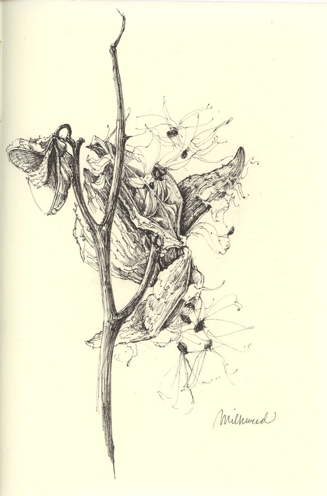 Feathery milkweed pods sit on my desk this week next to a stack of field guides, a large tome on the beginnings of modern natural history, and flyers for holiday strolls. Rounding out the desktop: pens, ink cartridges, notes with art class ideas, receipts, and the usual assortment of brushes, pens, and paints. Outside my window: gray, cold December. Tis the season for messy desks, indoor confinement, and more project ideas than time.