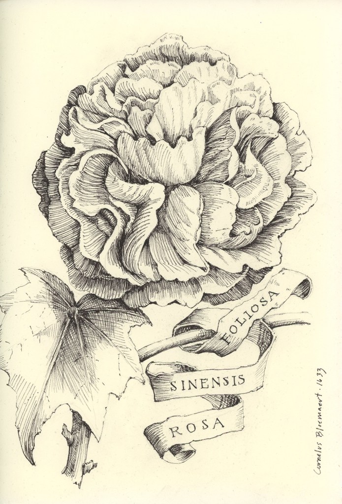2. Rosa sinensis foliosa copied from an engraving done by Cornelus Bloemaert in 1633, from the book The Eye of the Lynx: Galileo, his friends, and the beginnings of modern natural history by David Freedberg (2002). I could write an entire blog post just about doing this piece. It was fascinating to try to replicate the line work and figure out how the engraver did it.