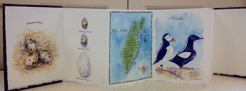 During the week, we’ll explore coastal islands and habitats, and we’ll have a chance to see Atlantic Puffins, Black Guillemots, and other seabirds. I’ll be leading a journal making workshop on the first day, helping people make a simple accordion fold journal that they can use during the week. This is my mock up, which I’ll continue to work in before heading to Maine, but hope to finish when I’m there.
