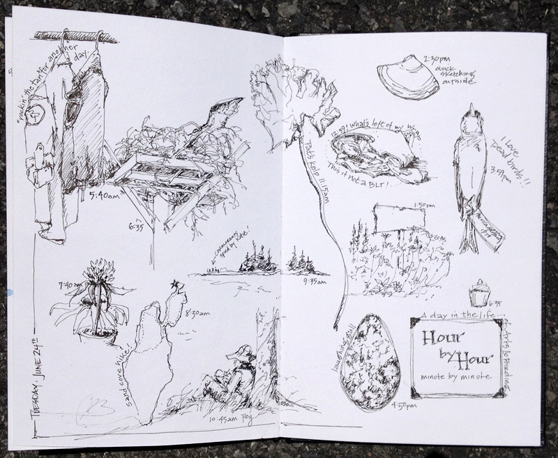 What if you had to draw something every hour all day, but each drawing could take only one to five minutes? That’s the challenge I issued to participants at a recent workshop on Arts and Birding in Maine…and this page is my own result. Starting at 5:40am with the clothes hanging in my closet, I found that sometimes I knew what I wanted to draw (the osprey nest), but more often, I just stopped at some point during each hour and drew whatever was in front of me (flowers on the breakfast table at 7:40am, my half-eaten turkey wrap at 12:59pm).