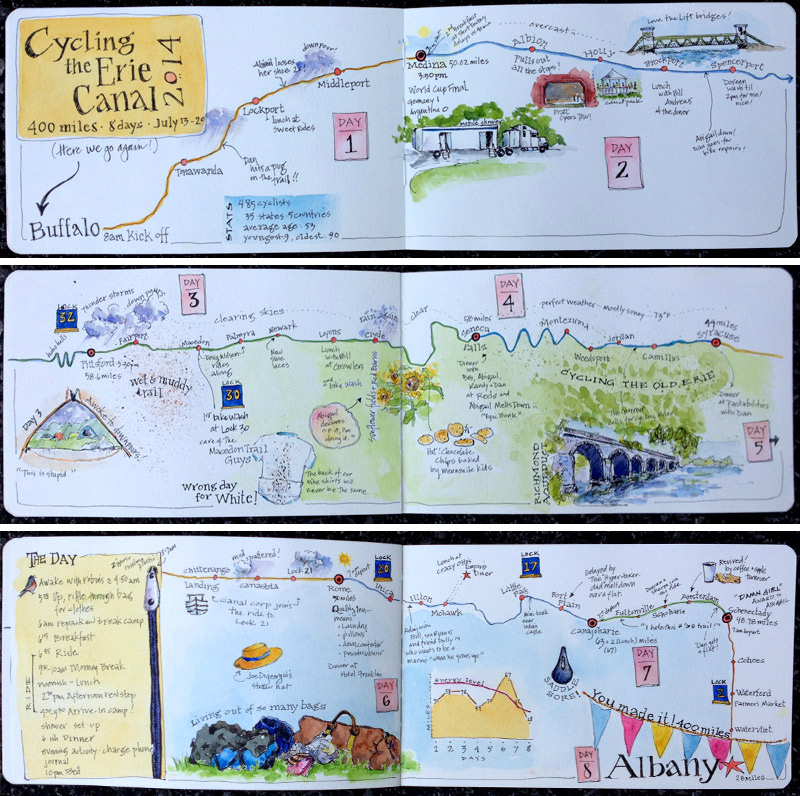 It’s tough to keep up a sketchbook when traveling by bicycle! But here’s the result of my recent 400 mile, 8-day cycling trip along the Erie Canal in New York State. (You can click on the image to enlarge it a bit.) Because I needed to cover 50 to 60 miles a day, I found it impossible to sketch until the riding was done. No matter how tired, I made a point of extending the schematic map eastward each evening, filling in some of the day’s adventures in words or pictures.