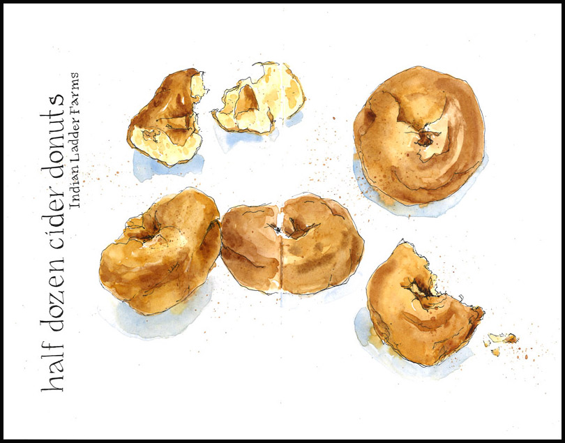 If donuts don’t immediately strike you as artistic subjects, you’re not alone. I got a few passing glances from the staff of the farm café and bakery when I sat down with my hot cider and bag of donuts and proceeded to paint them. Fortunately, it was an hour from closing time and the café was pretty deserted, so I sat contentedly savoring the quiet moment.
