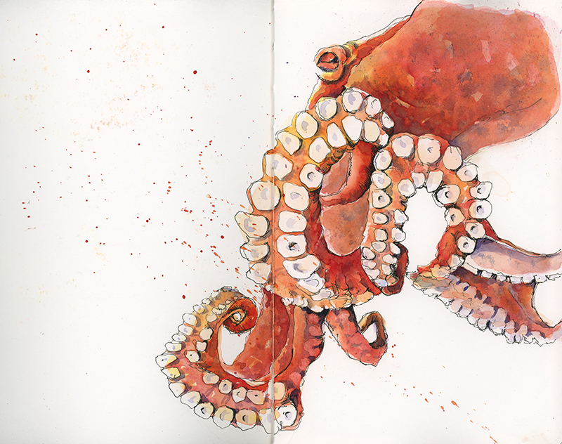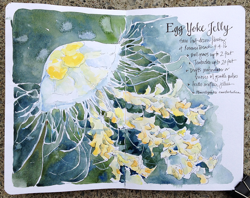 Before the workshop began, I took two days to explore and hike. I painted this octopus from a video in anticipation (i.e. wishful thinking) of seeing one in a west coast tide pool.  No luck; but I did see nearly a dozen egg yolk jellyfish, a fairly common west coast species, as well as other fascinating denizens of rocky tide pools in the Puget Sound.