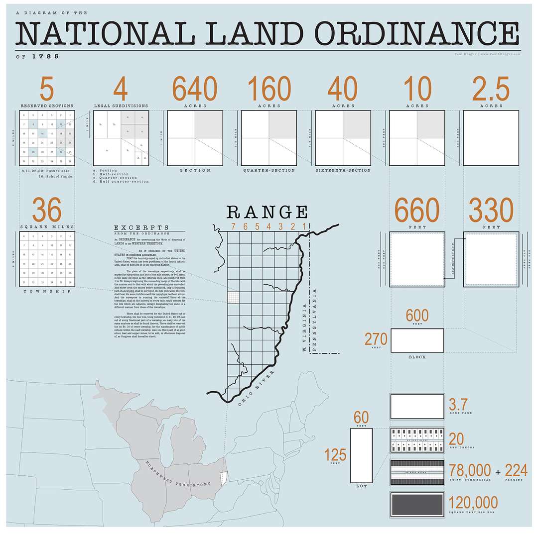 The pattern owes its existence to Thomas Jefferson and the Land Ordinance of 1785, which served as the basis of the Public Land Survey System used to divide property for sale and settling.