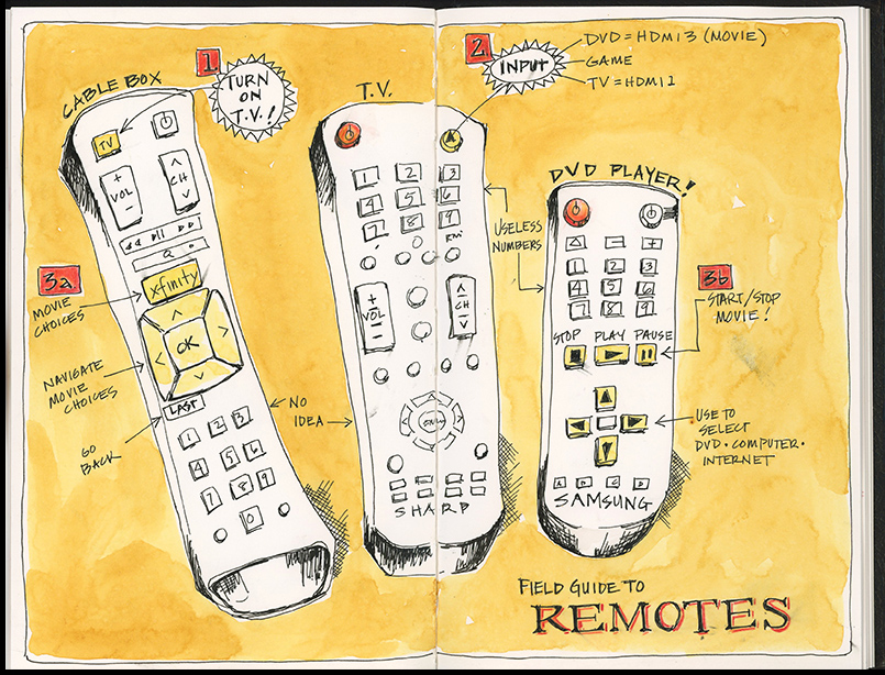 Here’s a quick sketch I should have made years ago. No attempt at beauty or precision, just a down-n-dirty guide so that I can finally watch a movie without assistance.