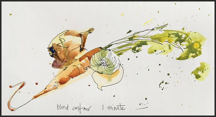 Tips & Techniques– Practice a few 30 second, 1 minute, and 3 minute contour and semi-blind contour drawings with a fairly simple subject. Fruits and vegetables are perfect. Work in pencil or pen, but don’t erase. See if you can get most of your subject down in just a few minutes. Next add a loose and light wash of watercolor. Let it dry. Then repeat; add two or three more layers of paint to deepen the colors and add depth.