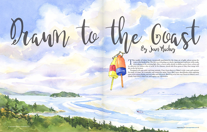 It’s thrilling to see my artwork in print this week in an article I wrote and illustrated for Passagemaker Magazine (a magazine for boaters). Drawn to the Coast is an illustrated essay about being inspired by the Maine Coast. Going from concept sketches to full size watercolors to seeing how the magazine’s designer put it all together was one of the most exciting aspects of this assignment.