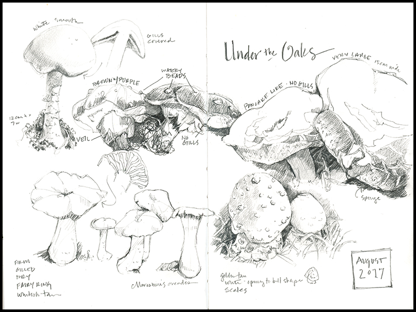 Within the last few weeks, more than ten species of mushrooms have emerged in a grove of oaks in our yard and Iām only familiar with one of them. Mushroom identification is complicated and depends on a number of factors that I tend to forget from year to year: whether or not there are gills and how they are attached, the shape of the cap, the color of the spore print, color, habitat, season, and more. For now, looking more carefully and making sketches and field notes before these ephemeral species disappear is more valuable than knowing the names. But soon, it will be good to have a guide to fungi on my shelf.