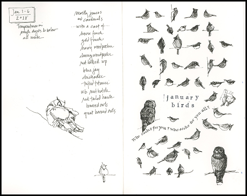 Subzero temperatures mean I’m inside, but birds are out in force at our feeders. They start at dawn and come and go or stay all day, eating as much as they can to fuel their survival against the cold. With this abundance of subjects, I have been focused on capturing bird shapes and postures with small, quick ink sketches. The beauty of this exercise is that you don’t invest in any one bird, you are simply training your eyes and hands to work together.