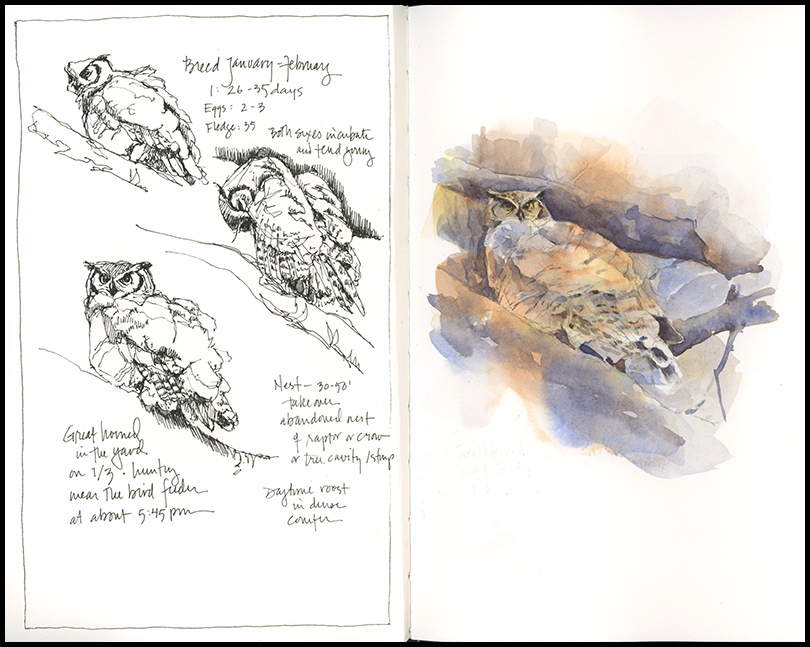 My second focus for the week has been owls, which I have not drawn much before. Barred owls have been calling in the stream-side woods next to our house for weeks. And we caught sight of a great horned owl nabbing a meal (likely a squirrel) near our feeders at dusk. Owls mate in January and February, so I expect to hear more activity in the coming weeks.