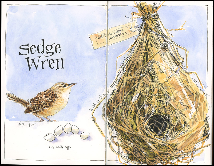 Tips & Techniques– Include field notes in your journal to make it a good reference for what you discover and learn. When I first saw the label on this nest I didn’t know that there were two distinct marsh wren species: a short-billed and a long-billed. I had seen marsh wren nests that didn’t look quite like this, and a quick Google search explained why—the ones I’d seen were made by the long-billed marsh wren. These two species have different colored eggs, too: white versus mottled purplish brown. Art, discovery, and learning fit together beautifully for me in the pages of my journal. I hope you have opportunities to do the same!