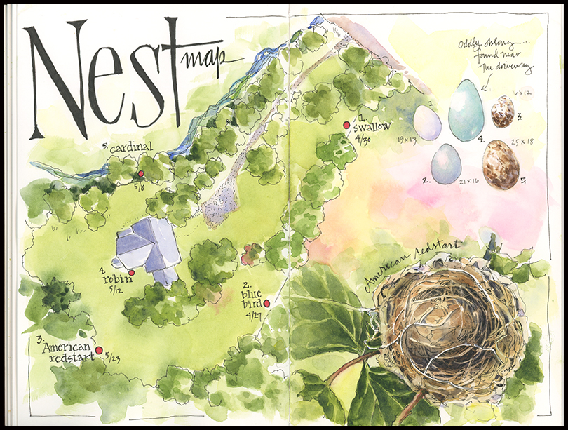 Tips and Techniques– I love making maps and find that it is an excellent way to learn and record information. I made this one so I would have a reference for future years’ nesting activity on our property. I used Google Maps to sketch the aerial view– it’s a great tool for getting the basics of the landscape geography you want to record. Once I had the map laid out, I added the nest, using a photo of the actual nest so as not to disturb the birds. I had been hoping an egg or two would have already been laid, but because I was a bit too early, I decided to add the eggs for each bird as a separate element. I used the Princeton Field Guide Nest, Eggs, and Nestlings of North American Birds by Paul Baicich and Colin Harrison as a reference, as well as an atypically oblong robin’s egg found abandoned near our driveway.