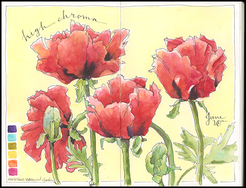 I am frequently a painter of subtlety: of small things that might be overlooked, of browns and blues and layers of green. Not today. Drawn in by the vivid, bold color of these poppies at the Berkshire Botanical Garden, I pulled out a whole new palette from a set of six high chroma colors from QoR to paint them. I have never used any of these colors before and it felt a little like driving a car for the first time– a little nerve wracking and reckless, but also liberating and fun.