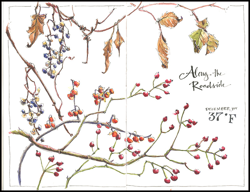 Yesterday was the kind of day I’ve been waiting for since winter arrived unexpectedly in November. Temperatures climbed above freezing, which felt almost balmy, and I spent nearly the entire day outside. After the oak leaves were raked and the remaining daffodil bulbs planted, I headed into the fields and down the road with my sketchbook. Shriveled wild grapes, thorny tangles of multiflora rose hips, and climbing vines of bittersweet not yet eaten by birds offered a bit of brightness against bare branches and brown grasses. They seemed the perfects things to sketch to capture the day.