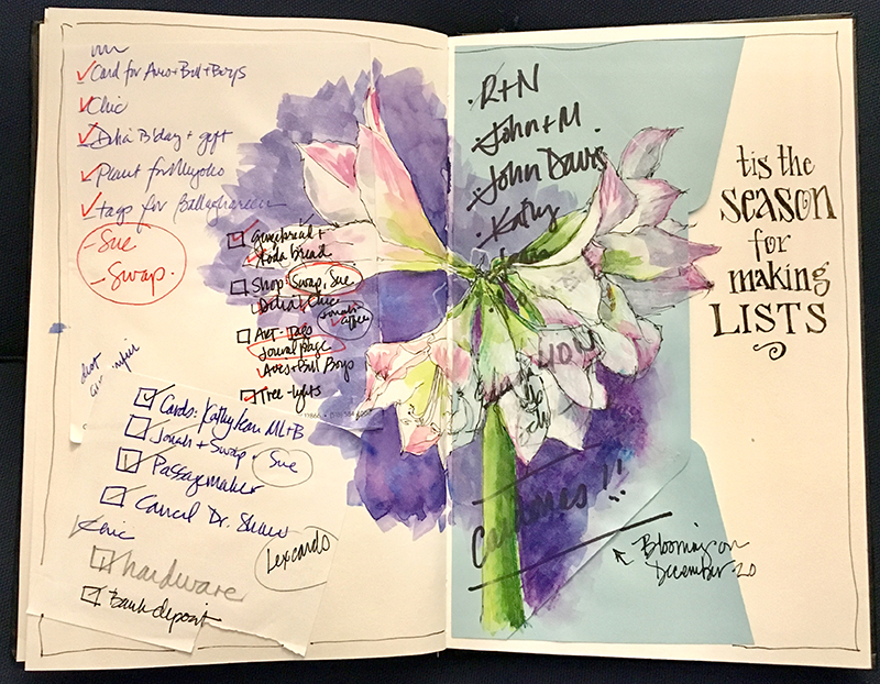 It’s a busy time of year in my workshop. ‘Tis the season for making lists, and creating gifts and cards and tags. This leaves little time for personal artwork. Instead, I glued my To Do lists into my journal and, as you can see, this page reflects the rather messy state of my affairs.