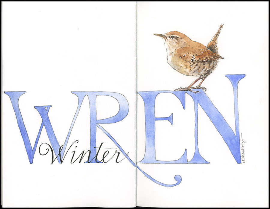 Letterforms and birds are subjects that frequently turn up in my journals. At first, I simply matched bold words with their subjects, but more recently, I’ve tried to get birds to perch on letters. It’s not always easy to do. You’ve got to know a bit about the anatomy of bird feet, and find the right placement to support the bird and balance the page. Here’s a fun one that I did today— the lovely winter wren.