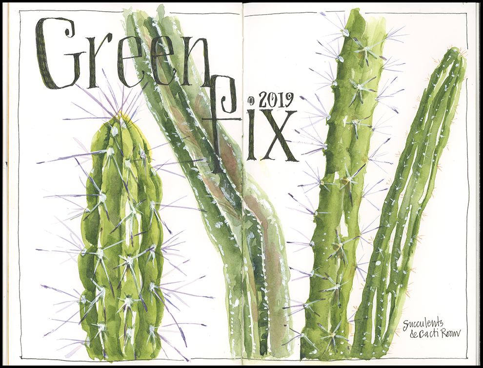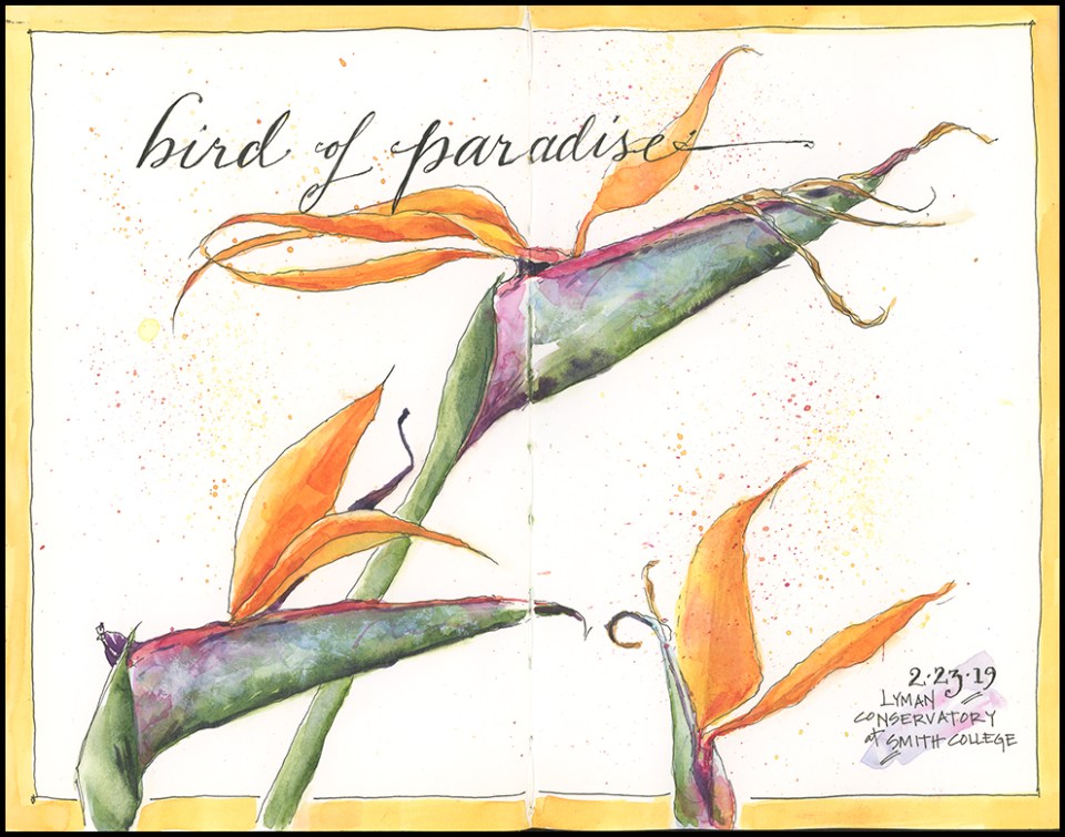 Tips and Techniques– Based on my experience at the conservatory, my tip this week is: don’t give up too soon on half-baked sketches. Painting conditions at the greenhouse were difficult—tight aisles, lots of people, and no way to spread out or relax while painting. I painted both of these pages standing up, and believe me, they were very rough watercolors when it was time to leave. Nevertheless, I had the concept and basic colors down, which enabled me to add details and text when I got home. How many times have you found yourself in the field without enough time to finish? I say: at least get started. Take some notes or a photo and finish later.