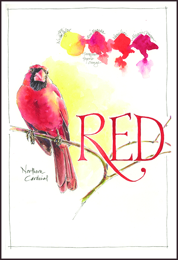 My previous post on tulips left me eager for more reds, though this week, I’m back to birds and words. What better choice for reds than the Northern Cardinal, the most colorful bird at my feeder in winter? But isn’t red just red, you ask? Well, absolutely not. You can see that I’ve experimented with different reds (and yellow) here— mixing combinations of transparent reds in a range of warm and cool tones. Other than alizarin crimson, these aren’t colors I use frequently, so this was a worthwhile experiment.