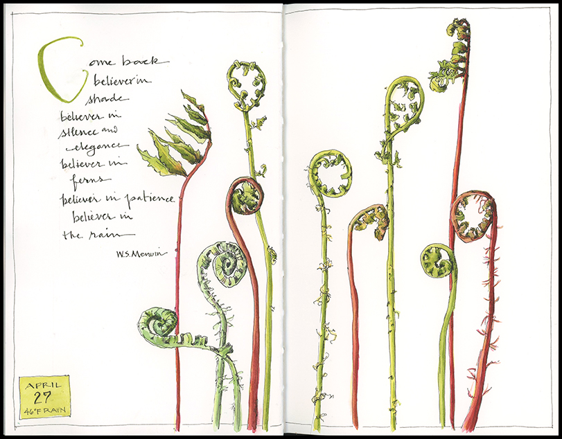 Tips and Techniques– My simple tip this week is to let observation and delight drive your sketching. Go out with no agenda and see what strikes you. I was drawn in by the variety of fiddleheads when I started looking more closely at them unfurling in the woods – some hairy, some smooth, some reddish-brown, others bright yellow-green. Had I gone out with a pre-planned idea of what I wanted to paint, I might never have seen them.