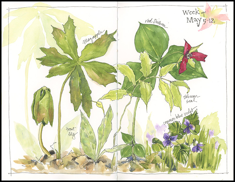 The glory days of springtime come fast and fleeting. Miss the trillium, and you have to wait a whole year to see it again. Migrating birds come, feed, and leave again while we sleep or work or are otherwise distracted. There never seems to be enough time in my spring; no way to capture it all before the symphony of greens gives way to summer. Still, I’ve managed some quick sketches in the woods and I was fortunate to be home when a pair of rose-breasted grosbeaks showed up at the feeder.