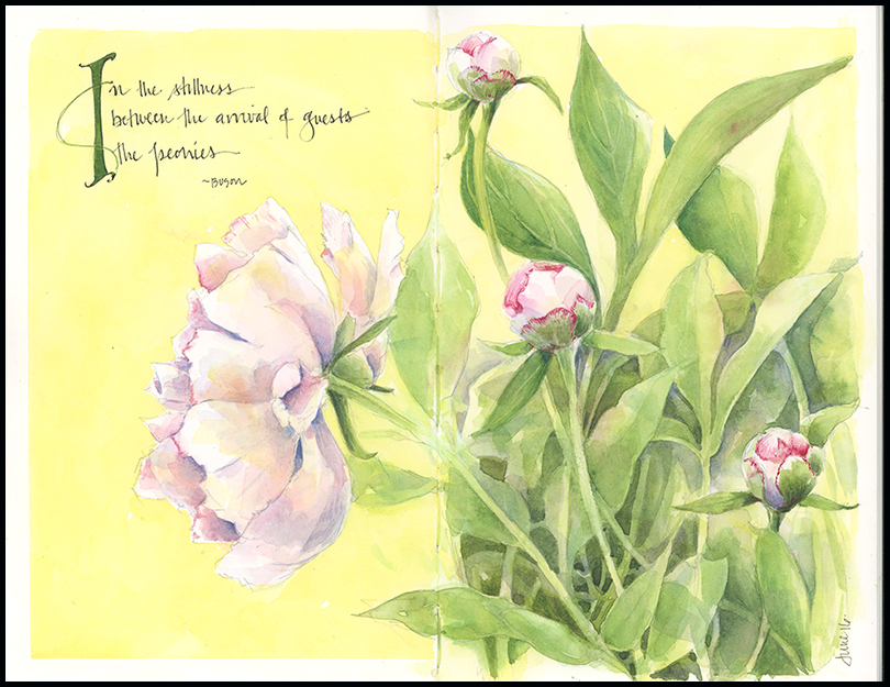 When peonies bloom, rain nearly always follows. And so it was that I lost my subject. Still, I am pleased to have June’s most elegant flower in the pages of my sketchbook, a few cut flowers on my table, and pink and white petals littering the garden.