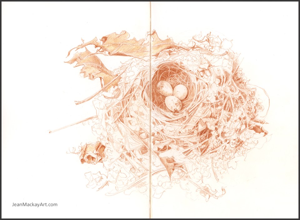 In this second piece, I used a single burnt sienna colored pencil for the entire nest. I started with the inner part of the nest to develop the darkest values and worked my way outward to build the form. I like the ghostly quality that came from blowing out some of the lightest tones.