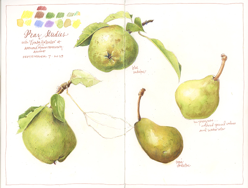 My go-to artist materials are watercolor and ink, so I enjoyed switching it up this week by using colored pencils. I started with pears during an artist’s “Sip & Draw” with master botanical illustrator Wendy Hollender. Wendy often starts with a single colored pencil to develop the basic form and values and then applies layers of watercolor and colored pencil to further develop her subjects. You can see some of this process below, where I left some leaves and pears unfinished (click to view larger).