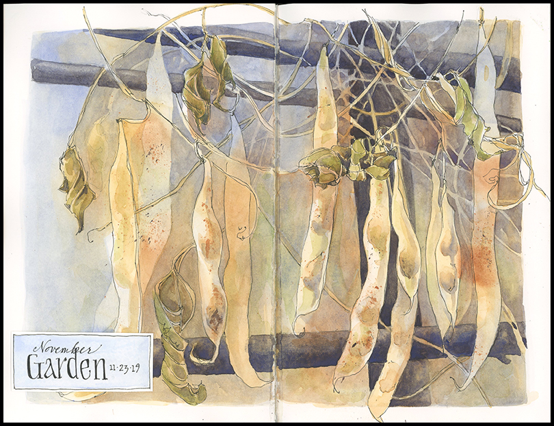 The November garden is as stark as the rest of the world. The vibrancy of the August palette has given way to browns and grays. A touch of green and ocher and russet remain. It isn’t much, but I’ll take it. A tangle of once-scarlet runner beans is all there is for a final garden painting.
