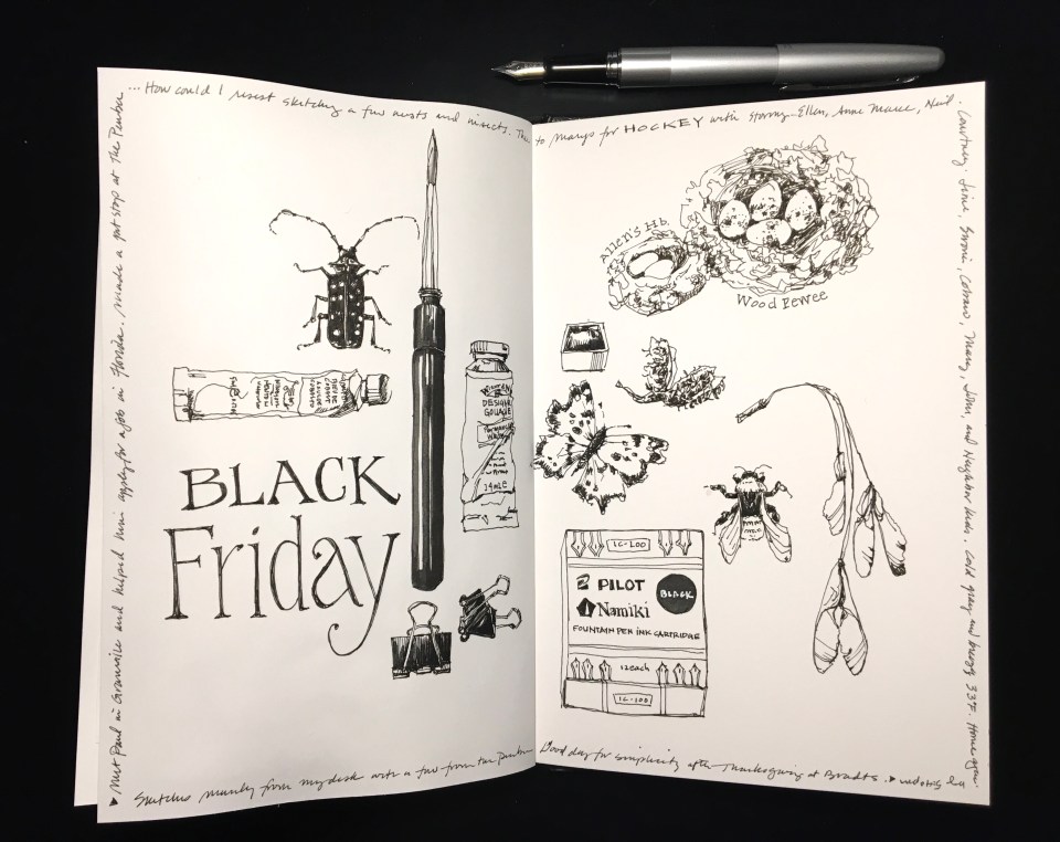 Today seemed like as good a day as any to switch things up and go all ink. This started with the notion to sketch random things on my desk, but the addition of the nests and a few insects from a very brief visit to the Pember Museum of Natural History rounds out the collection nicely. Art and nature…pretty much what is always on my desk.