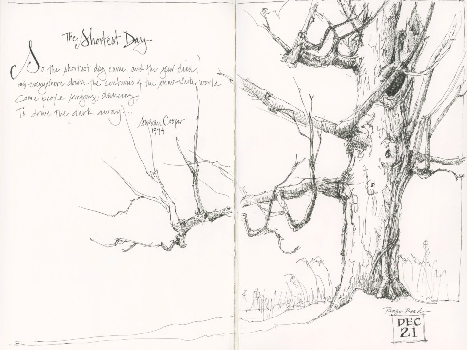 I might prefer sun, but it seems right for the solstice to be overcast and cold. I headed out with my sketchbook this afternoon when the temperatures climbed into the 20s to capture a glimpse of the shortest day. This old sugar maple, overlooking fields and evergreens, has seen its share of turns around the sun. It’s limbs stretched outward and upward from the frozen ground. Stark, against gray skies, it yet possessed a warmth about it that was inviting on this winter day. A solstice tree.