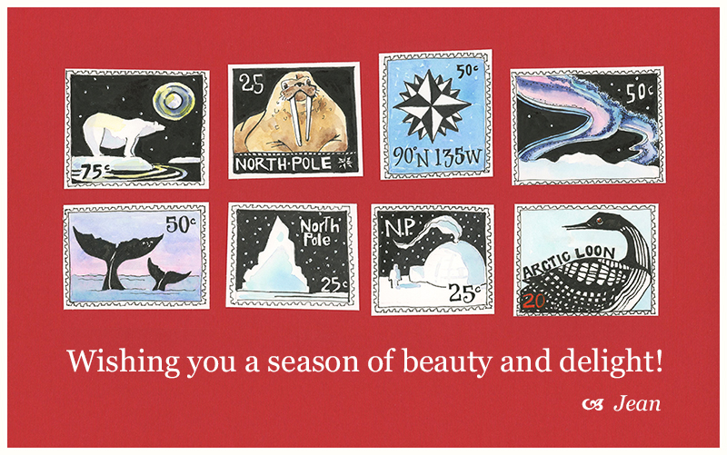 A note about this artwork: I created eight arctic stamps this year as part of a Christmas letter I write each year from the North Pole to several special children. I included the stamps in a different format in the Christmas letter, but thought they made a nice collection when viewed together. Have a wonder-filled and Merry Christmas!