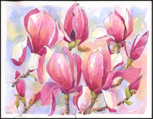 After a winter of painting with brown and earth-toned pigments, it feels extravagant to use so much magenta. But this particular variety of magnolia had magnificently deep-colored blossoms and I found myself dipping into paint pans that I rarely use. With the tree in full bloom and fallen petals on the ground it was a delight to be surrounding by so much color.