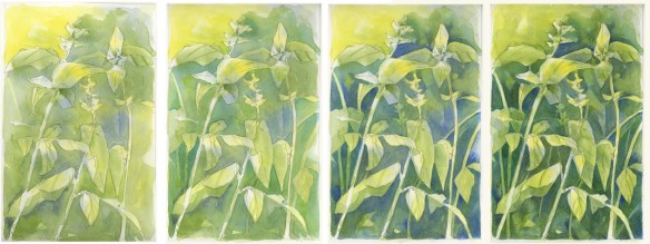 – Sorry I didn’t take a photo of the initial pencil sketch and first layer of wet in wet wash. But this shows the progression thereafter of painting mainly the negative spaces between the plants and adding additional shapes to suggest layers of basil in the garden. I find this technique especially useful for foliage. Deciding when to stop is sometimes difficult…I probably could have stopped at the second image, but I wanted to see what would happen if I pushed the darks.
