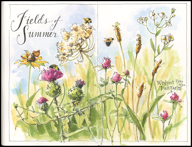 Tips and Techniques– This sketch is a composite of various flowers and grasses in the field. Rather than standing in one place where all of this was in view, I moved from flower to flower to fill the page. I often use this technique when outside because it allows me the freedom to roam freely, discovering and drawing as I go. I sketch directly with a black Micron 02 pen and I may or may not add watercolor on the spot. A small travel watercolor set and water brush work well, though I frequently add more layers of watercolor at home. The text and border come last. Hope you are enjoying some late summer wandering and sketching!