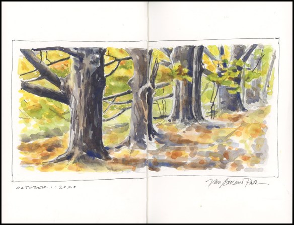 At 5 o’clock, the sun was already low on the horizon, casting a golden light that would blaze for a short while more and then vanish. After eight hours at my desk, I quickly closed my laptop, picked up my sketchbook, and headed to a nearby preserve to immerse myself in what remained of a perfect fall day. I didn’t walk far before being surrounded by the colors of the season. Dark trunks of old sugar maples cloaked in a perfect glory of yellow, orange, green, and russet lined the old carriage road that marks the boundary of the preserve. I wish I could have taken you along to see the display, but this sketch will have to do.