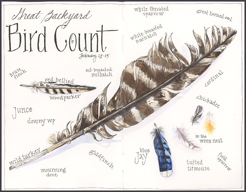 It’s been mighty cold here this week— the temperature most days hasn’t crept out of the teens—decidedly not outdoor sketching weather. But I did manage a walk in snowy woods, where tracks of squirrels, deer, mice, and beaver gave away the presence of far heartier mammals. I also found this fine turkey feather, which was enough to get me started on this sketchbook page. This weekend is the Great Backyard Bird Count, a global count and celebration of birds. I was happy to record 16 species this morning from the warmth of the kitchen, while the thermometer outside read -7 F.