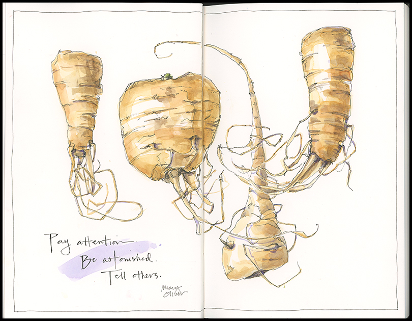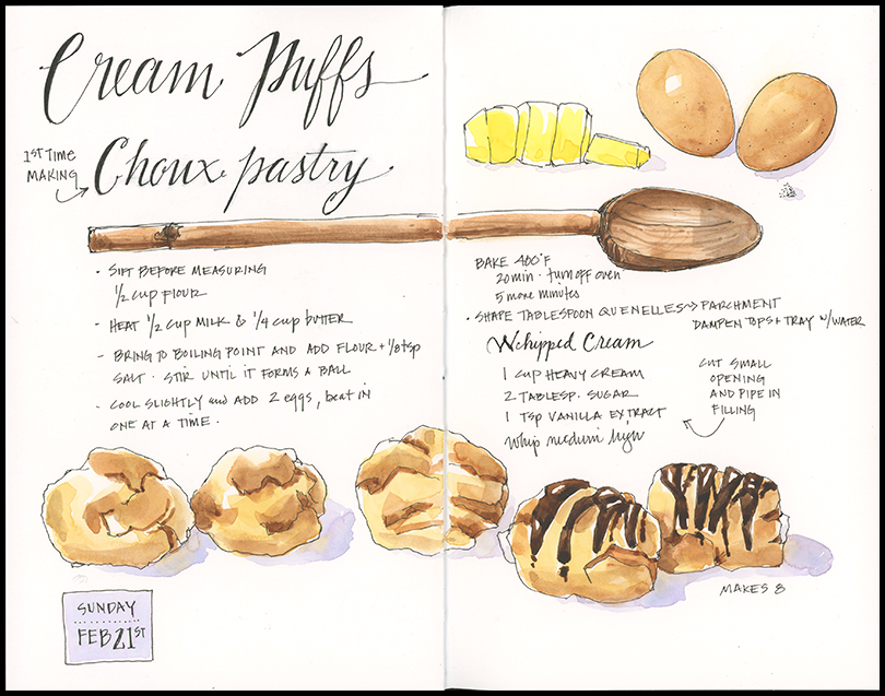 My sketches this week are an effort to appreciate the small pleasures of life and to look for joy in the everyday. Typically, I wander out into nature for inspiration, but I didn’t need to go beyond my own kitchen this week. For the savory: a bunch of ordinary parsnips that seem to dance on the page. And for the sweet: a delectable batch of cream puffs that I made from scratch for the first time ever. If I could offer you one or the other, there’s no question which it would be. Instead, I give you both and wish you sweet moments to savor during the week ahead.