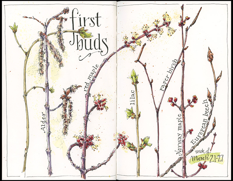 It is such a joy to read your posts and to study your beautiful journal pages. I love the little touches of pollen, the hovering bee, the swish of green over the date — but of course, the rest is just so inspiring! We are fortunate here in Vancouver to have plenty of colour already and the skunk cabbage in the ravine next to our house has big, bright, yellow flames of skunk cabbage.