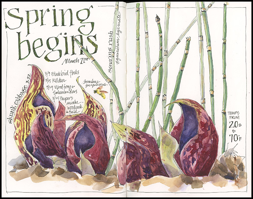It is such a joy to read your posts and to study your beautiful journal pages. I love the little touches of pollen, the hovering bee, the swish of green over the date — but of course, the rest is just so inspiring! We are fortunate here in Vancouver to have plenty of colour already and the skunk cabbage in the ravine next to our house has big, bright, yellow flames of skunk cabbage.