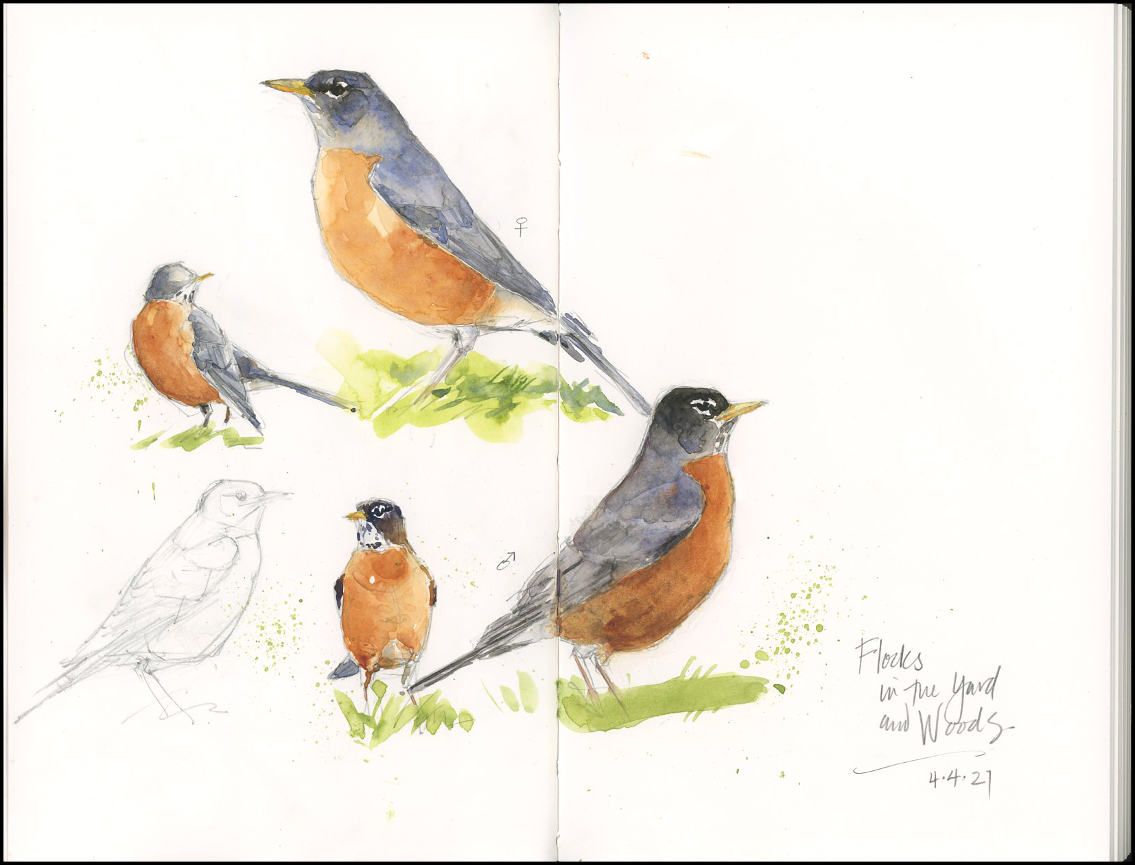 Whether it’s their sweet song, colorful breast, or way of bobbing across the lawn, seeing robins in springtime is a welcome sight. They spend the winter in small flocks feeding on berries and sheltering in nearby woods, where they blend in well with russet-colored oaks leaves and gray bark. But as the grass begins to green, robins are frequenting my yard more often, probing the soft ground for worms and other insects. They are common birds, yes, but no less deserving of attention, gratitude, and a sketch.