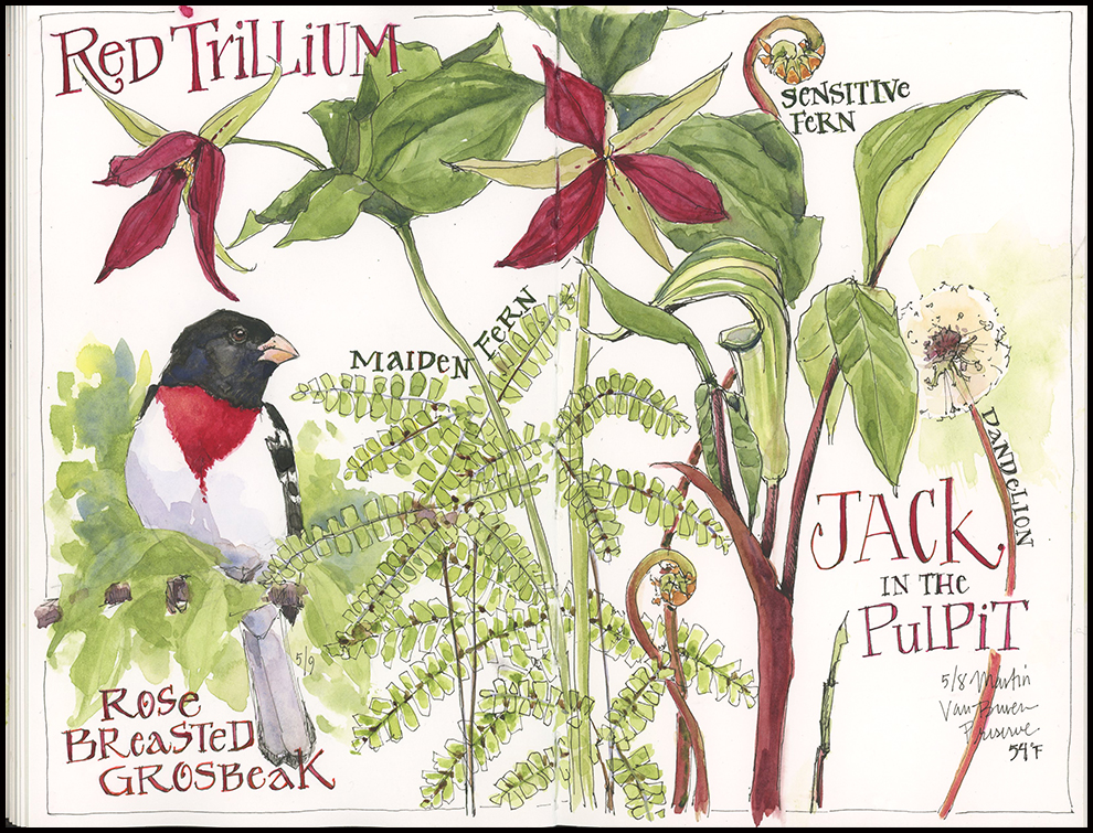 • Thanks Teresa– This page started with a bit of frustration with a water brush, sitting on cold ground to paint the Jack-in-the-Pulpit and trillium, but ended up being a fun page to complete.