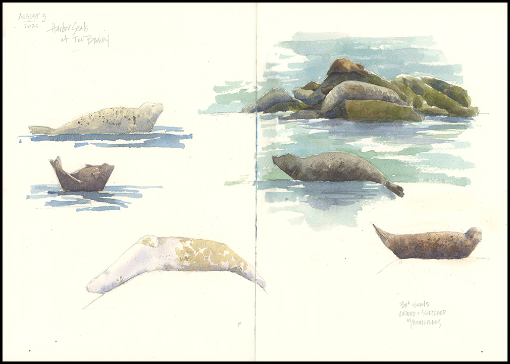 Tips and Techniques: When you sketch from binoculars, you only get about six second to remember what you saw—hardly enough to make a detailed drawing. Still, if your subject weighs 250 pounds and isn’t moving quickly, you can make it work. Fortunately, the shapes and postures of seals are not too complicated, and they tend to rest in similar poses, so you can watch and sketch and wait for them to resume a pose if they move. When sketching from shore, I painted on location using an Etchr sketchbook with excellent watercolor paper. From the canoe and rocky ledge, I sketched in pencil only in my Stillman & Birn Zeta sketchbook and added text, watercolor, anatomy, and close up head shot later.