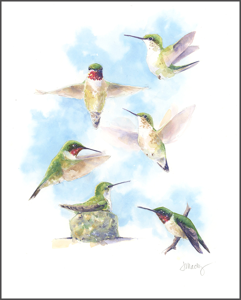 Did you know that a group of hummingbirds is called a shimmer? Hummingbirds don’t “flock” together, the way many bird species do, so several names have come to describe them as a group. You can also call them a charm, a glittering, a tune, a bouquet, or a hover. Truth be told, I have only seen hummingbirds individually of late, but painting several in different positions seemed a better way to capture their movement, beauty, and vitality.