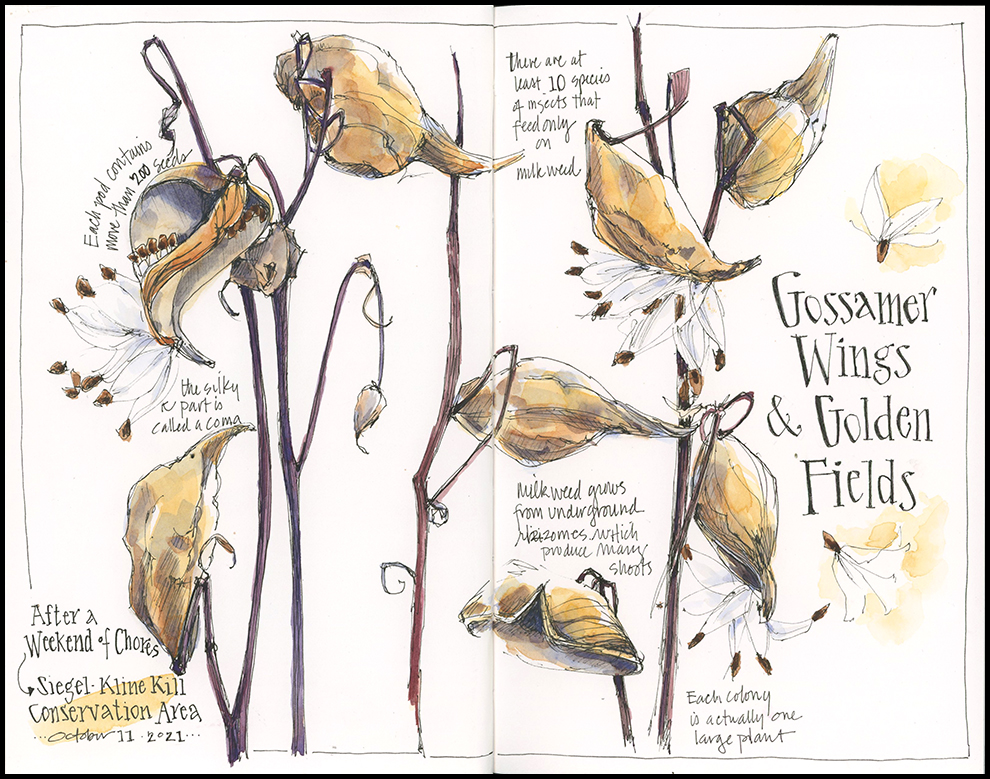Our list was long last weekend: paint the back porch railing, fix windowsills, repair broken glazing, prime bare trim, rake leaves, mow the lawn, mulch the gardens, brush hog the field edge, clean out the gutter, mount the rain diverter…you get the idea. It was a beautiful fall three-day weekend, perfect for a hike or bike ride, or for getting stuff done. That’s why you didn’t see a blog post and I didn’t pick up my sketchbook until the sun was sinking low on Monday afternoon. I went to a local conservation area, where the recently mown meadow glowed in the late-day light. In the margins that escaped the reaper, I was drawn to milkweed pods, now split open and brittle, their work done too, casting seeds on the breeze.
