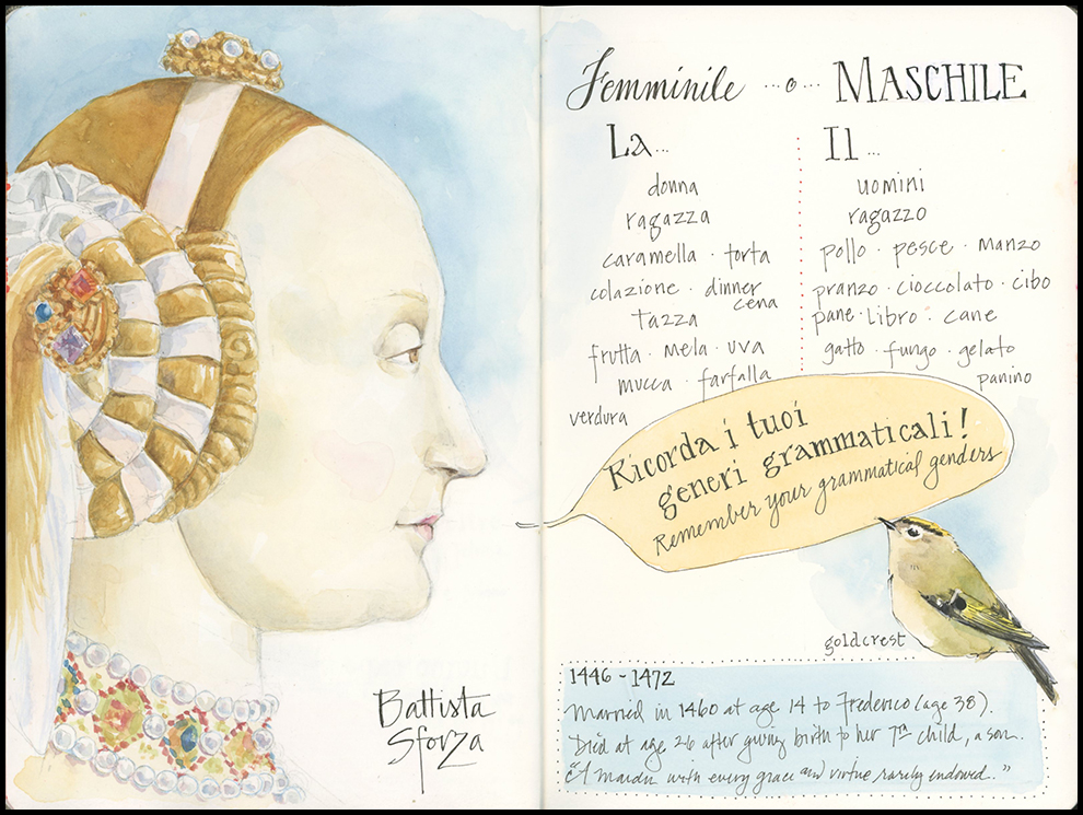 The rest of these pages capture other things I’m learning—the transition from Gothic to Renaissance writing scripts, another bird, the challenge of mastering feminine and masculine Italian grammar (who decided that beef (il manzo) is masculine, but steak (la bistecca) is feminine?). This is not the stuff of travel guides but is nonetheless an intriguing way to begin.